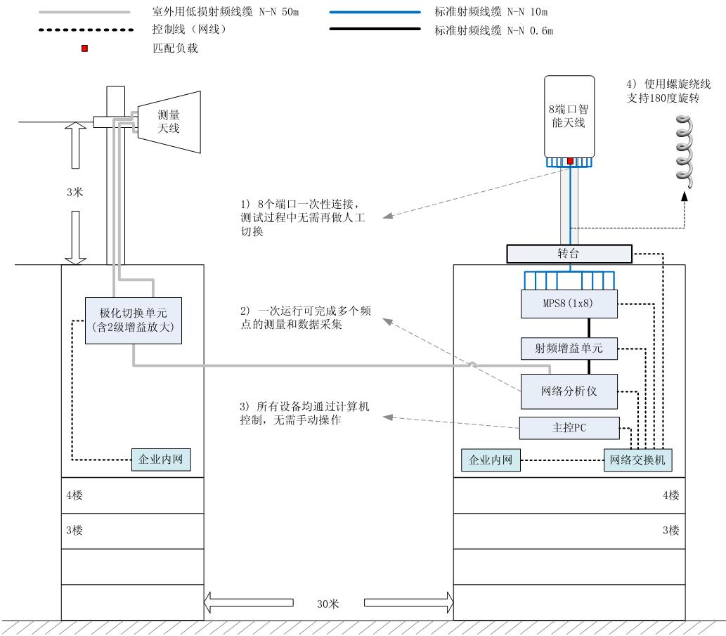 研辰科技成功交付智能天线开阔场OTA测试系统。系统安装在两栋4层楼楼顶,基于MPS多端口射频开关矩阵,配合矢量网络分析仪,对智能天线进行快速外场测试,以最高的性价比为客户大幅度提升智能天线方向图测试的效率和精度。